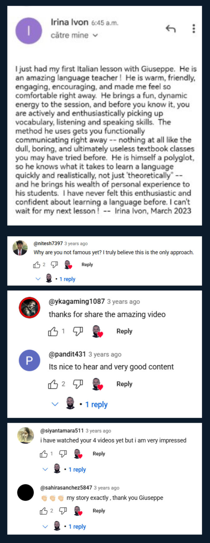 Giuseppe will use psychological techniques that he's gained over a decade to help you learn Italian in the most efficient way possible.